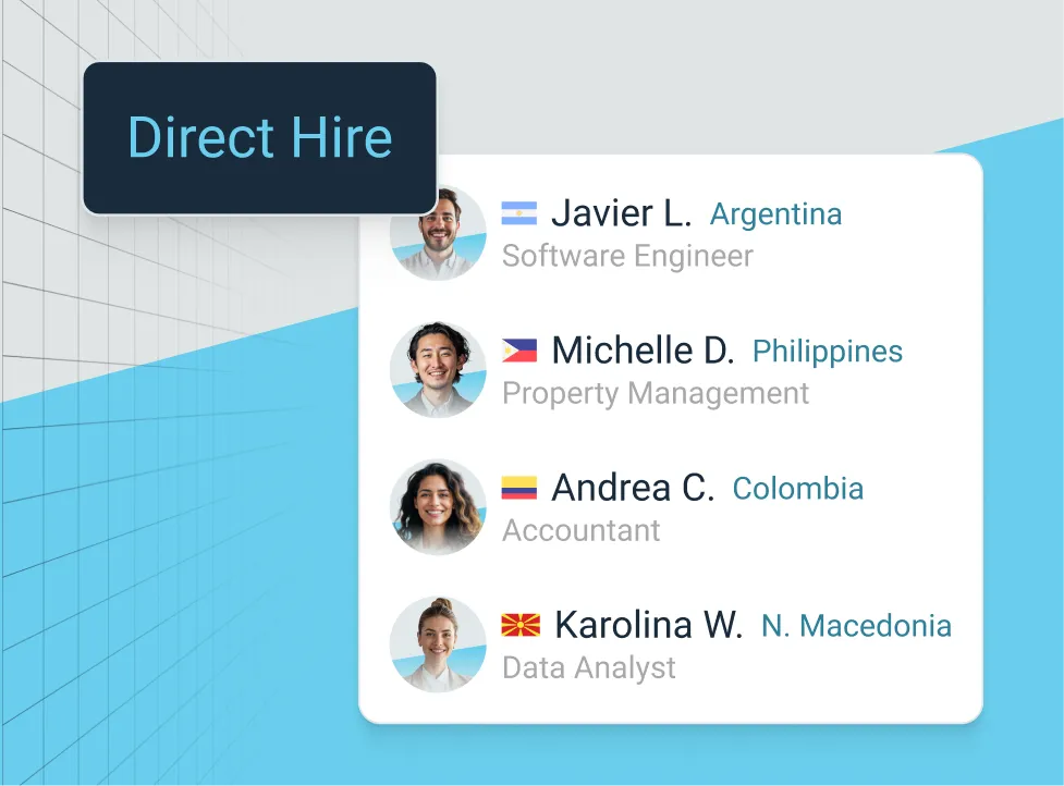 We find and vet the best global talent for you. Once the right person is found, you hire them directly on your own payroll. This is the best choice for companies that already have their own HR and hiring systems.